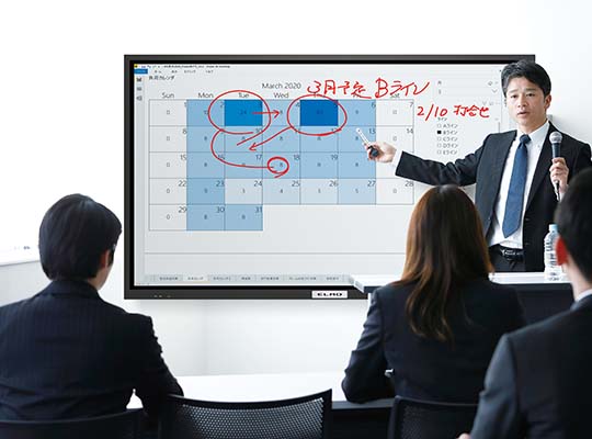 ディスプレイ機能と書き込みの一体型を実現した当製品は、画面の資料共有だけでは伝わりにくいことを書き込んで共有することで、正確な意思疎通や闊達な議論を促す「会議室のDX化」施策として、多くの企業から導入を検討されています。サイズは55~86インチの4種。ご用途に応じた周辺機器のご相談にも対応させていただきます。
